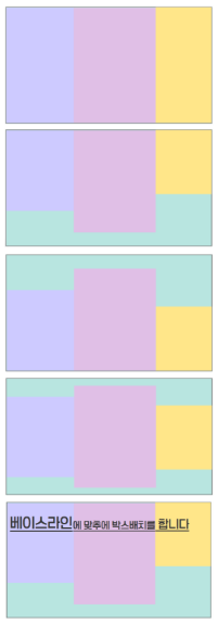 교차축 방향으로 플랙스 아이템 배치하기 박스를 확장하여 배치, 박스를 교차축의 시작점에 배치, 박스를 교차축의 끝점에 배치, 박스를 교차축의 중앙에 배치, 박스를 글자 베이스라인에 맞춰 배치 |