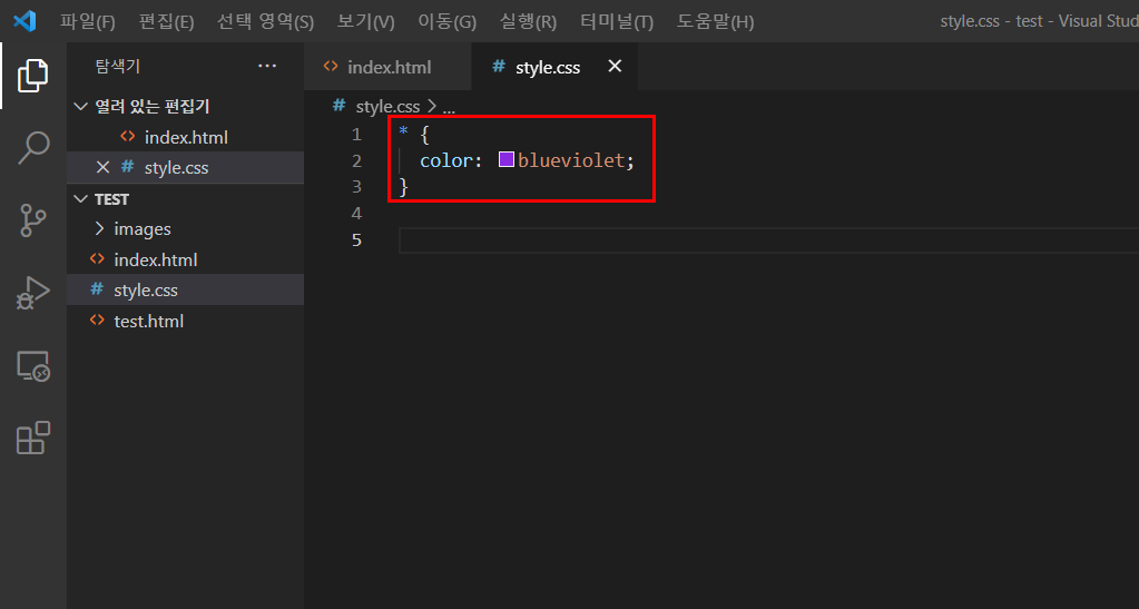 모든 태그의 색상이 보라색으로 한번에 변경된 걸 확인할 수 있네요. 한번에 모든 태그를 바꿀 수 있다니 참 좋죠? 그래서 보통 margin이나 padding 값 등기본값을 정할 때 사용합니다.