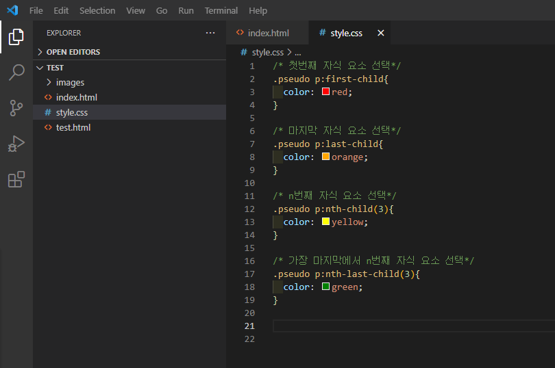 우리는 앞서 여러가지 선택자들을 공부했습니다. 그런데 코딩을 하다보면 앞에서 배운 선택자들로 지정하기 어려운 경우가 생깁니다. 예를 들어, 커피 메뉴판을 만들었는데 메뉴판의 몇번째 커피명이라든지, 커피콩 설명단락의 첫번째 글자 등에 스타일을 주고 싶은 경우가 있습니다. 이런 경우리 클래스 이름 앞에 콜론(:)을 붙여 가상 클래스를 만들어서 사용할 수 있습니다.