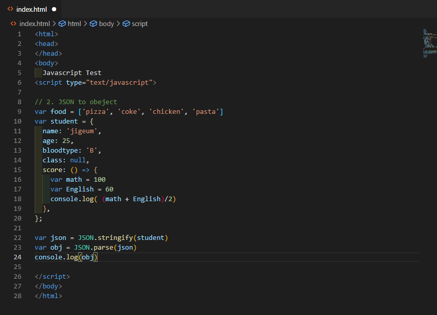 : JSON의 dtatype은 숫자(number), 문자열(string), 불리언(boolean), 객체(object), 배열(array), null입니다. 예시를 보니 문자열과 숫자, null이 잘 출력된 걸 볼 수 있네요. 그런데 score함수는 출력되지 않은 것 보이시나요? JSON은 함수로 값을 할당 할 수 없습니다.