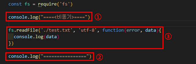 처리과정을 살펴보겠습니다. ① 처음에는 '====<동기>===='를 출력하고, ②fs.readFileSync 함수가 파일을 읽을 때까지 기다렸다가 text를 출력하고(test.txt파일에는 "Hello, Node.js"가 적혀져있씁니다.), ③ 마지막으로 '================'를 출력하겠네요.