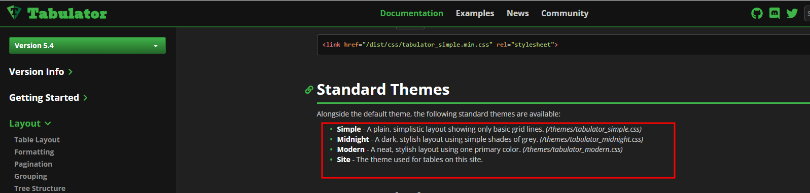tabulator 홈페이지에서 왼쪽 메뉴를 클릭하면 지원하는 테마가 나옵니다.